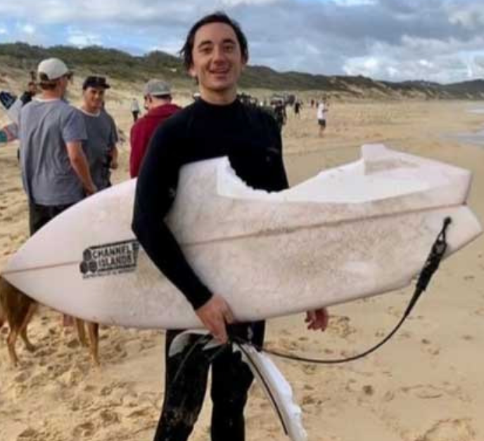 Witnesses saw the shark shoot up into the air after knocking Bruton off his surfboard, snapping his leg rope and leaving a huge bite mark on the right rail of his board.