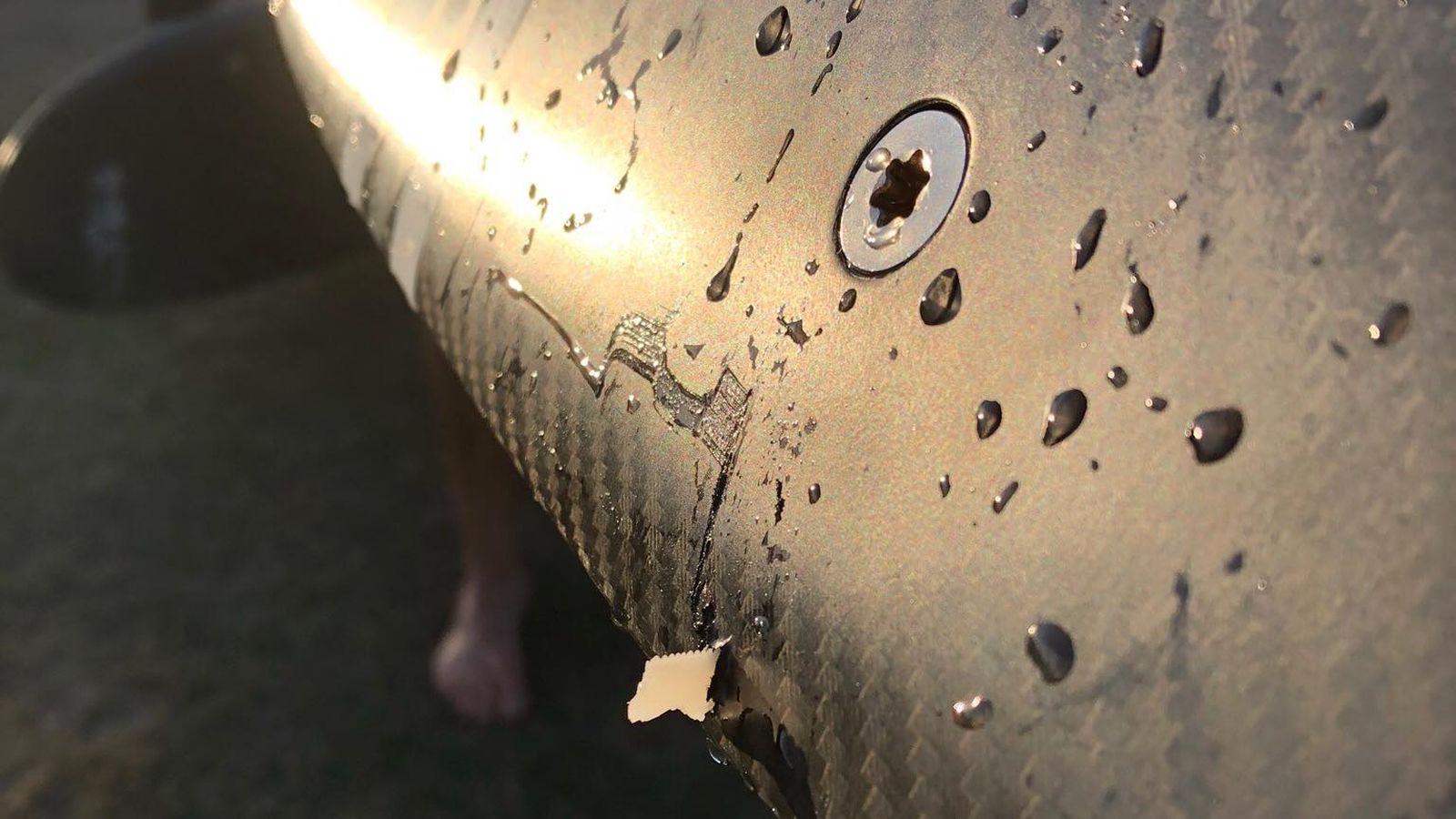 Linda Marchant Sinclair shared photos of what appeared to be a shark tooth in the surfer's board.